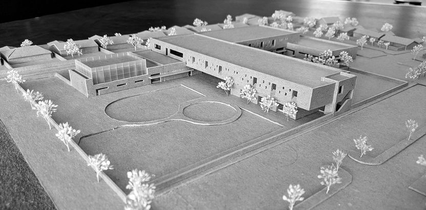 ARROYO DEL OSO ELEMENTARY SCHOOL MODEL, SCALE 1/32" = 1'- 0", TWO PLY BROWN CHIPBOARD. MODEL BUILT FOR JON ANDERSON ARCHITECTURE WITH ELLIOT HIELD